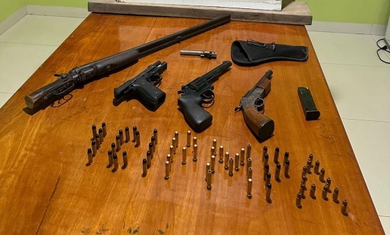 Na casa, que estava vazia no momento, a polícia encontrou uma vasta lista de materiais ilícitos, sendo uma pistola Taurus PT 917 (9mm) com numeração raspada e 13 munições; uma garrucha calibre .22, uma espingarda com coronha serrada, um cano com ferrolho de pistola 9mm; e 47 munições calibre .38.