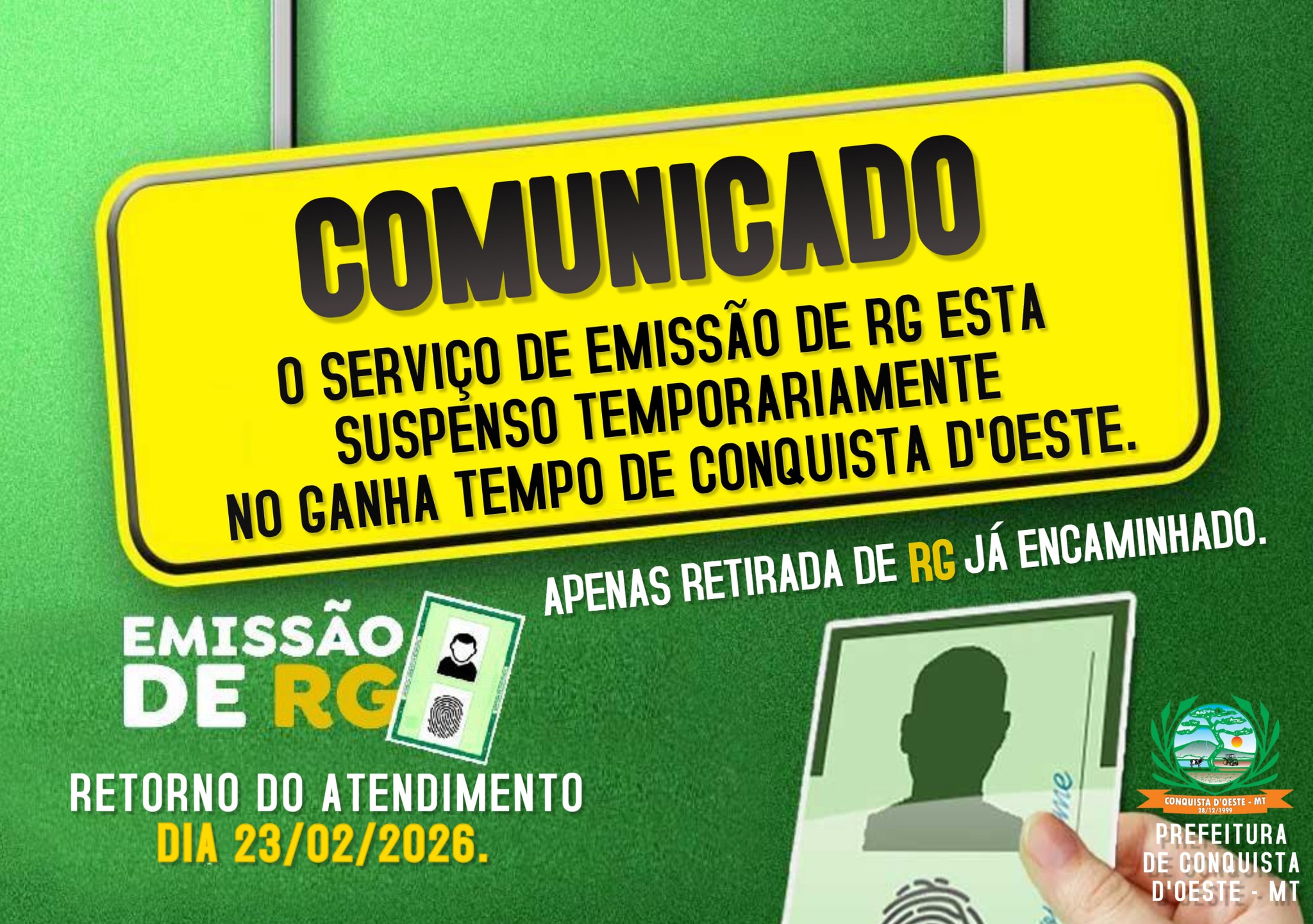 Informamos que o serviço de emissão de Carteira de Identidade (RG) encontra-se temporariamente suspenso no Ganha Tempo de Conquista D’Oeste.
