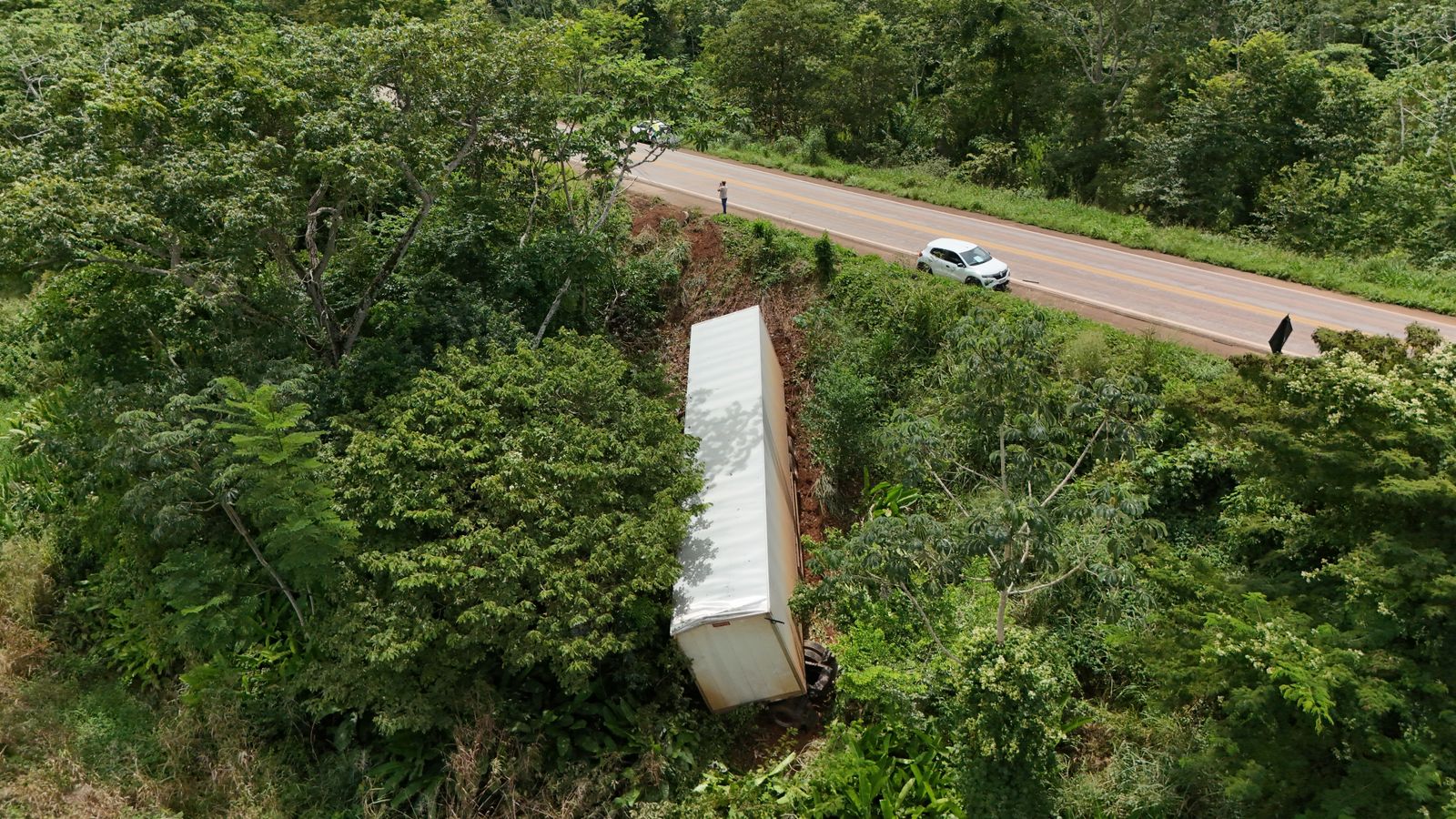 A carreta saiu da pista e caiu em uma valeta às margens da rodovia.