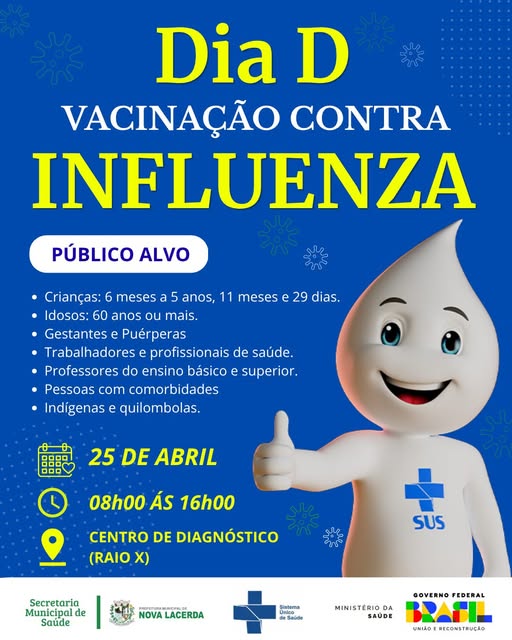 A Prefeitura de Nova Lacerda convida toda a população para participar do Dia D de vacinação contra a Influenza, que será realizado no dia 25 de abril.
